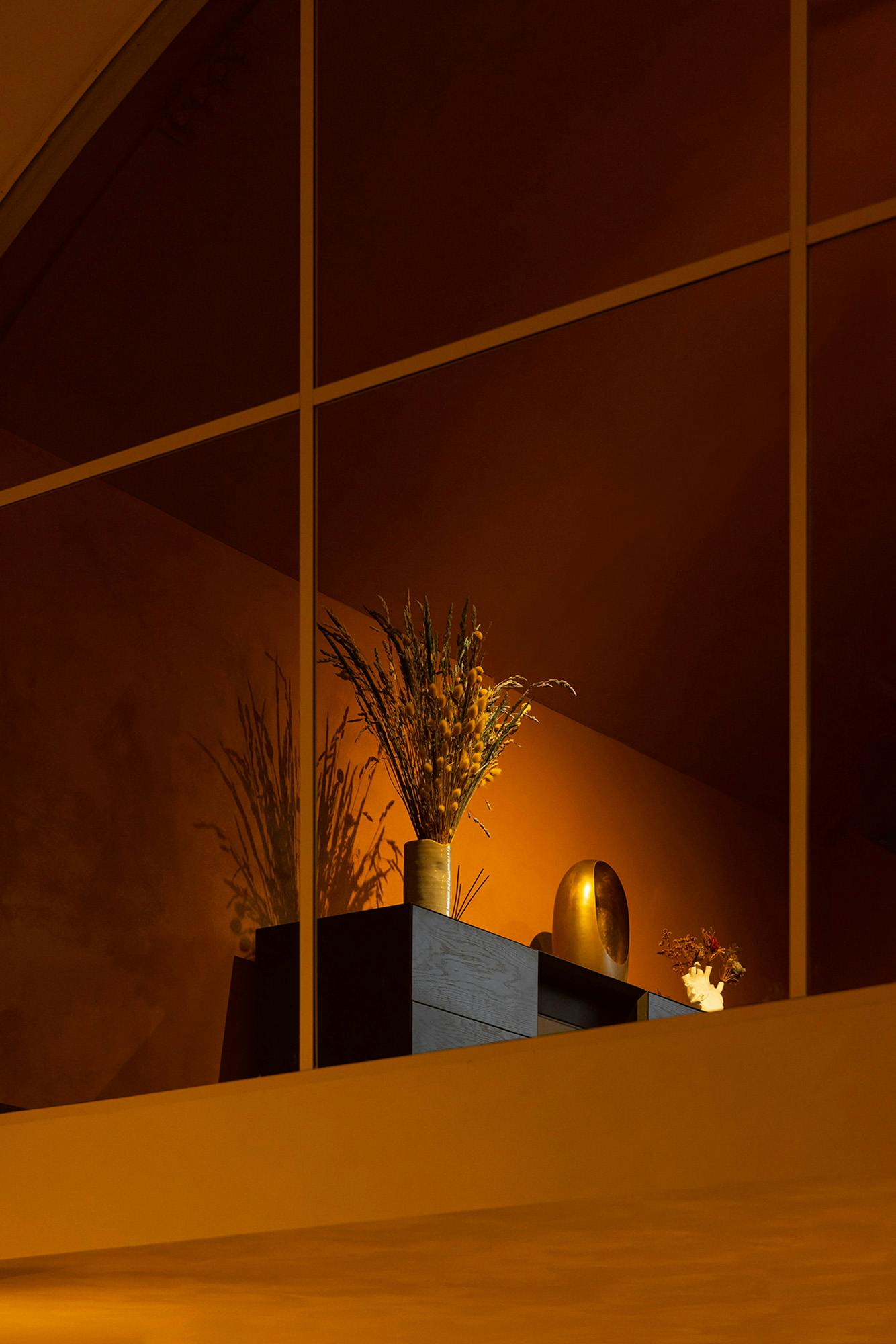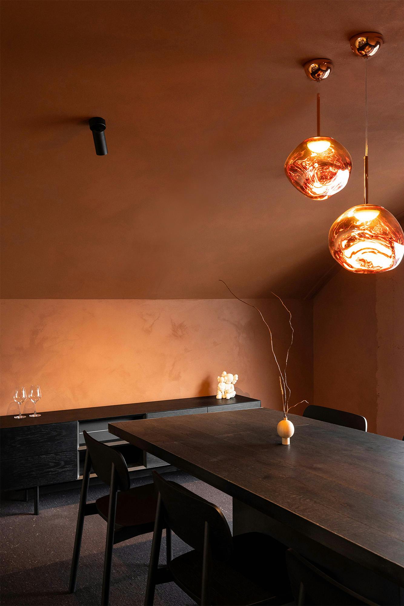 Carmine Red wraps the walls, eliciting a serious but informal gesture to the space where serious discussions are had.