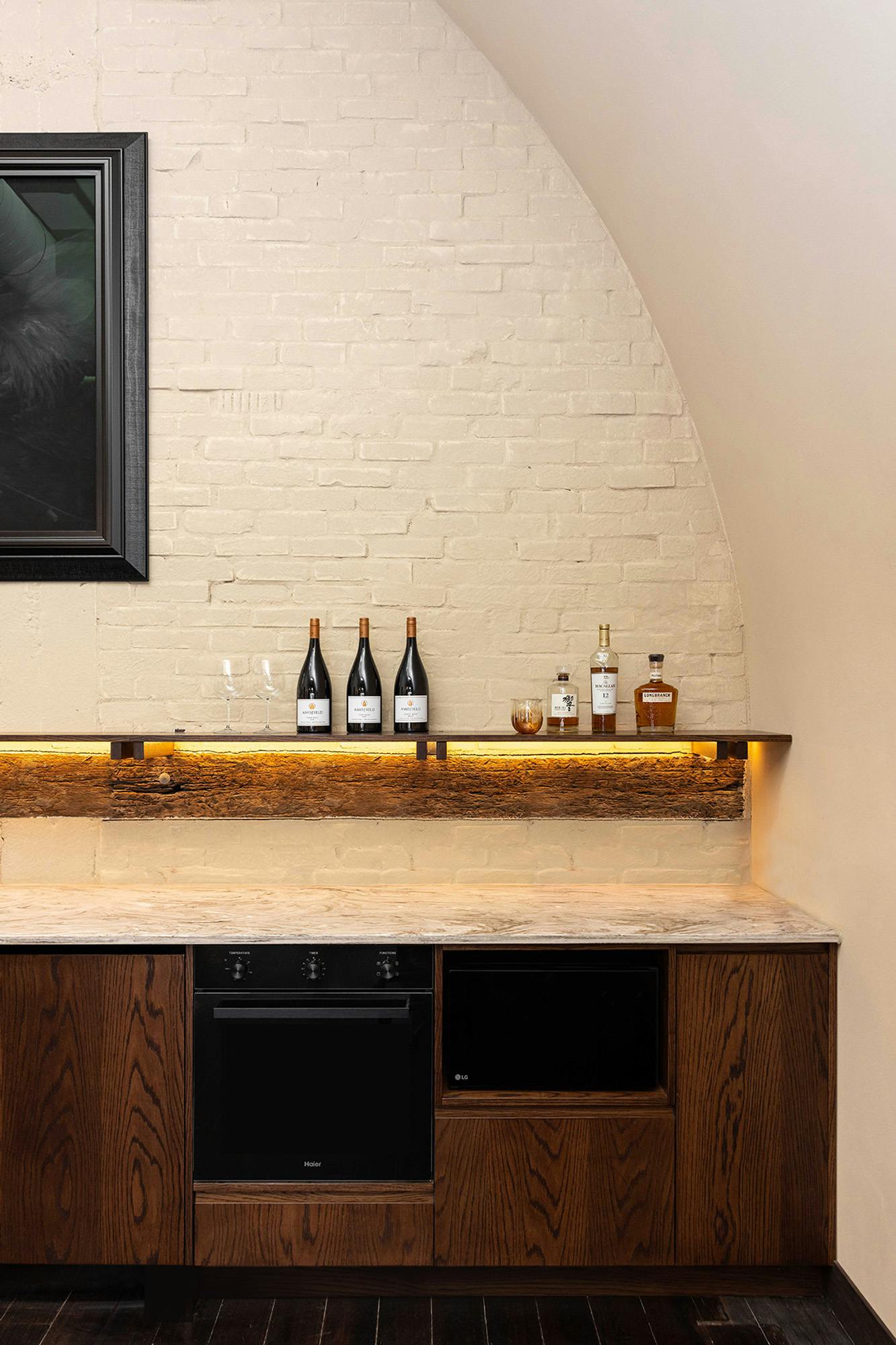 Kitchen cabinetry has been delicately installed to reveal the original timber lintel, and exposed brick has been bagged with thickened plaster to ensure longevity.